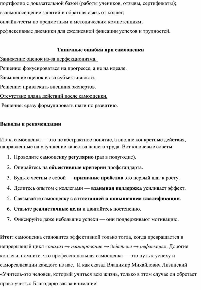 Итог: самооценка становится эффективной только тогда, когда превращается в непрерывный цикл «анализ → планирование → действие → рефлексия». Дорогие коллеги, помните, что профессиональная самооценка — это путь к успеху и самореализации каждого из нас. И как сказал Владимир Михайлович Лизинский «Учитель-это человек, который учиться всю жизнь, только в этом случае он обретает право учить.» Благодарю вас за внимание!