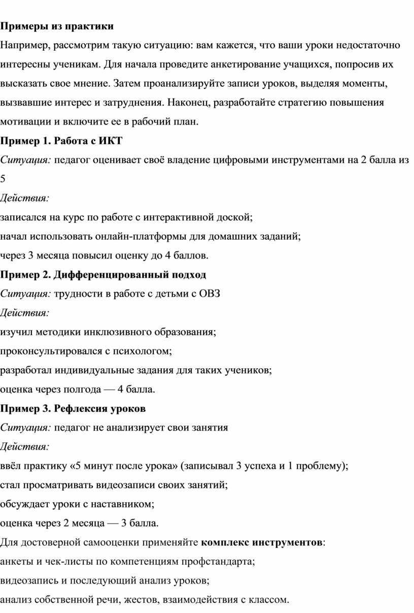 · Наблюдение за собственной деятельностью: регулярный анализ уроков, занятий, внеклассных мероприятий. Записывайте наблюдения за своими уроками, фиксируйте успехи и трудности.