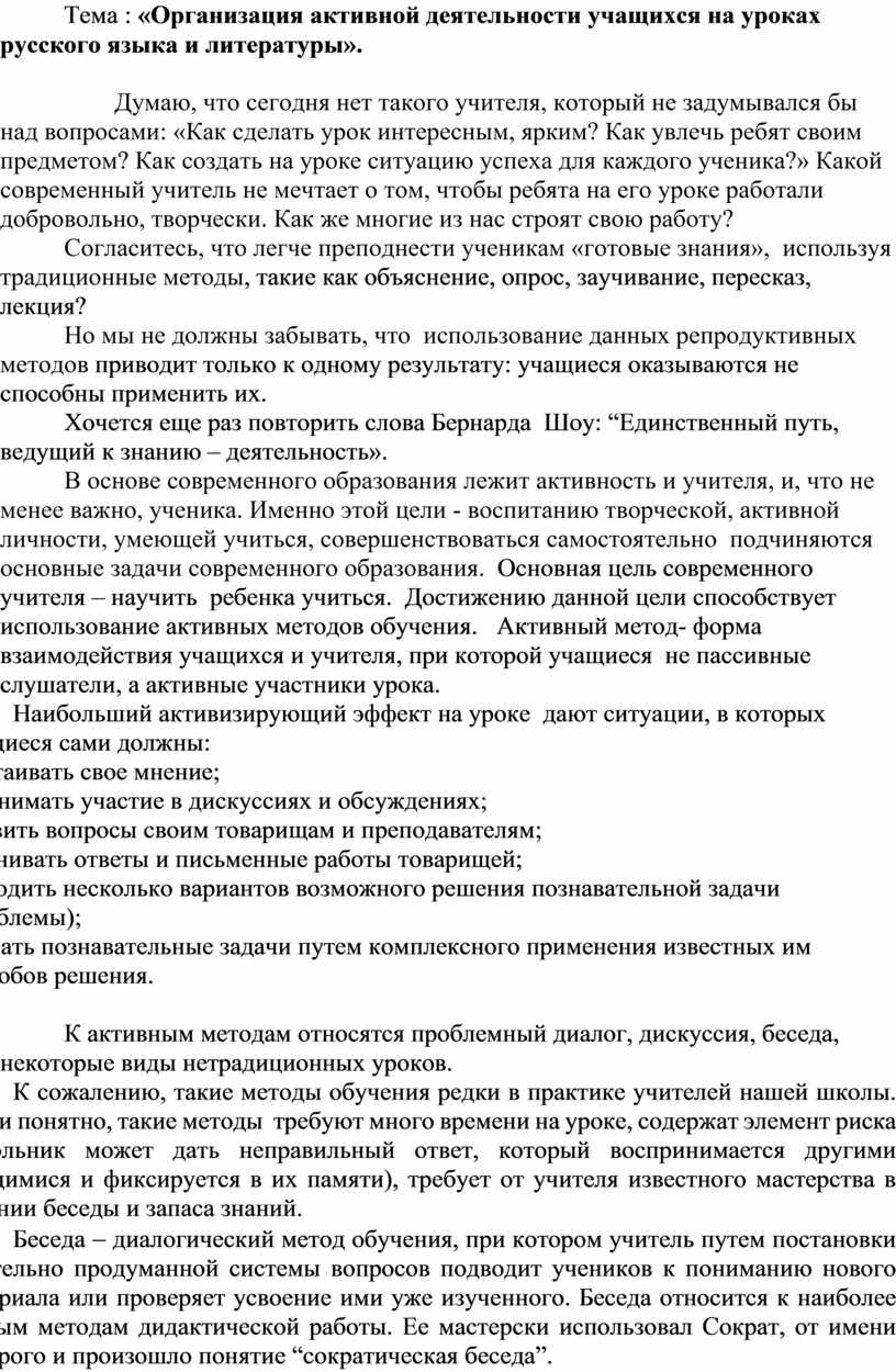 «Организация активной деятельности учащихся на уроках русского языка и литературы».