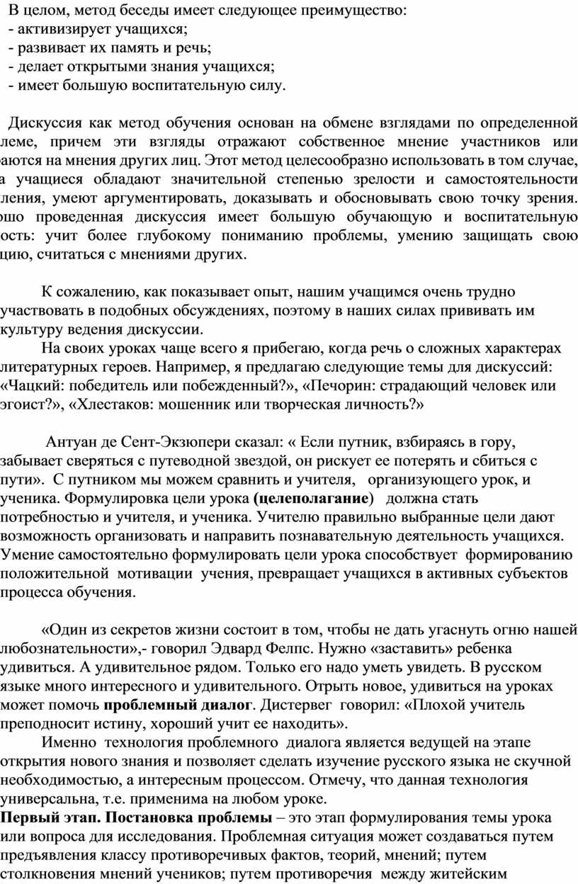 К сожалению, такие методы обучения редки в практике учителей нашей школы. Оно и понятно, такие методы требуют много времени на уроке, содержат элемент риска (школьник может дать неправильный ответ, который воспринимается другими учащимися и фиксируется в их памяти), требует от учителя известного мастерства в ведении беседы и запаса знаний.