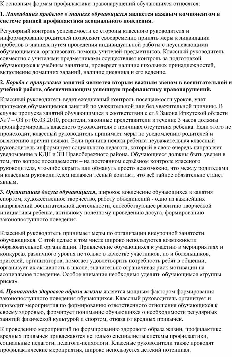 Работа классного руководителя по правовому воспитанию и профилактике правонарушений и преступлений среди несовершеннолетних должна носить систематический характер. Работа ведется в соответствии с планом воспитательной работы и согласно плану мероприятий по предупреждению правонарушений среди трудновоспитуемых несовершеннолетних по следующим направлениям: профилактическая работа (индивидуальная работа, вовлечение обучающихся в классные и общешкольные мероприятия, классные часы, профилактические инструктажи, рейды по месту жительства), организация досуговой деятельности, работа с родителями, правовой всеобуч, организация каникул.
