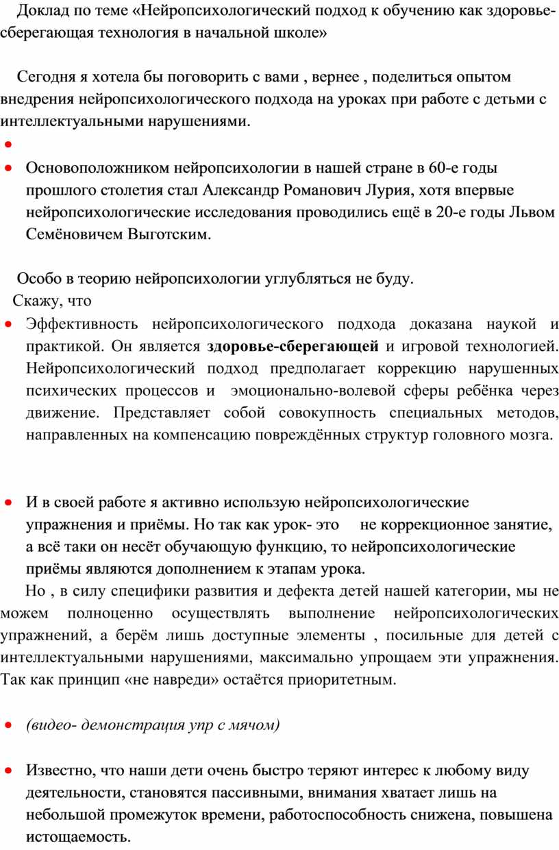 Доклад по теме «Нейропсихологический подход к обучению как здоровье-сберегающая технология в начальной школе»