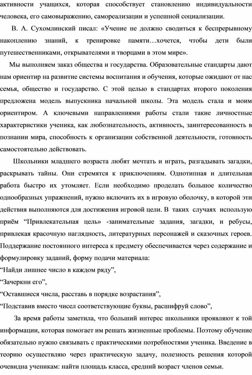 В. А. Сухомлинский писал: «Учение не должно сводиться к беспрерывному накоплению знаний, к тренировке памяти…хочется, чтобы дети были путешественниками, открывателями и творцами в этом мире».