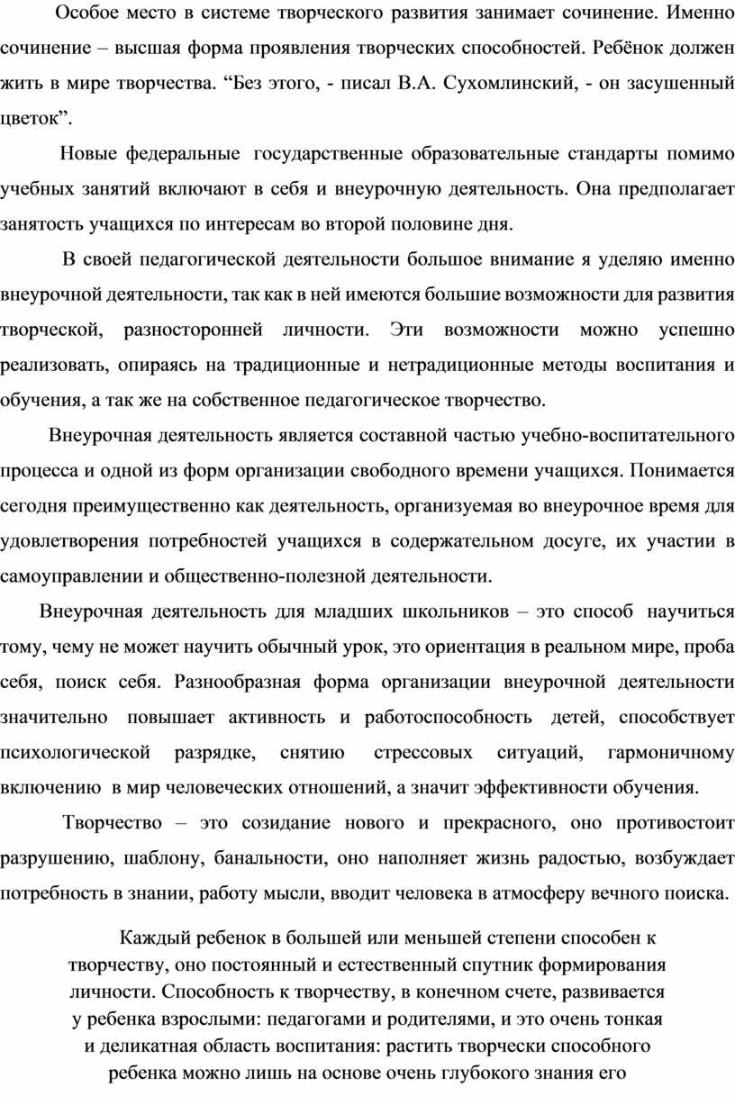 Особое место в системе творческого развития занимает сочинение. Именно сочинение – высшая форма проявления творческих способностей. Ребёнок должен жить в мире творчества. “Без этого, - писал В.А. Сухомлинский, - он засушенный цветок”.