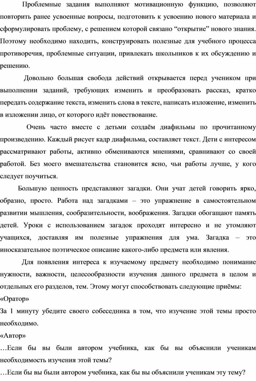 Школьники младшего возраста любят мечтать и играть, разгадывать загадки, раскрывать тайны. Они стремятся к приключениям. Однотипная и длительная работа быстро их утомляет. Если необходимо проделать большое количество однообразных упражнений, нужно включить их в игровую оболочку, в которой эти действия выполняются для достижения игровой цели. В таких случаях использую приём “Привлекательная цель» -занимательные задания, загадки, и ребусы, привлекая красочную наглядность, литературных персонажей и сказочных героев. Поддержание постоянного интереса к предмету обеспечивается через содержание и формулировку заданий, форму подачи материала: