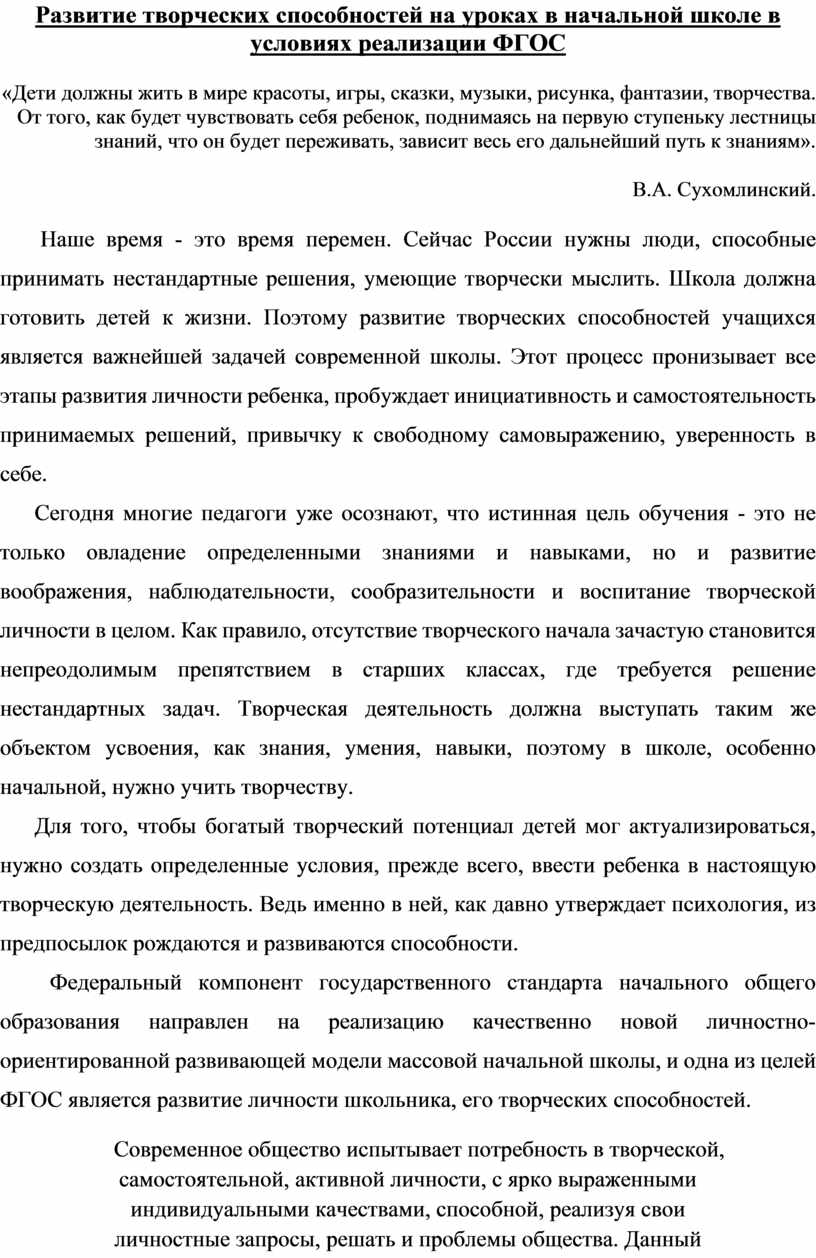 Развитие творческих способностей на уроках в начальной школе в условиях реализации ФГОС