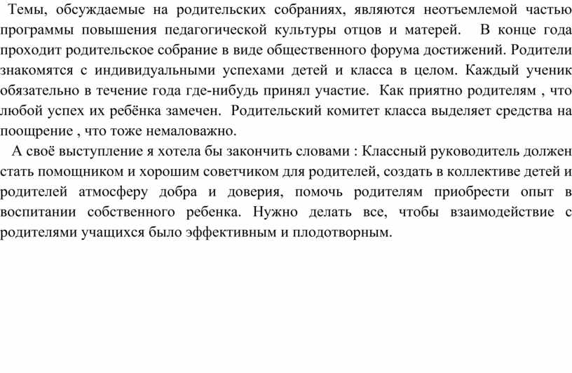 Темы, обсуждаемые на родительских собраниях, являются неотъемлемой частью программы повышения педагогической культуры отцов и матерей. В конце года проходит родительское собрание в виде общественного форума достижений. Родители знакомятся с индивидуальными успехами детей и класса в целом. Каждый ученик обязательно в течение года где-нибудь принял участие. Как приятно родителям , что любой успех их ребёнка замечен. Родительский комитет класса выделяет средства на поощрение , что тоже немаловажно.