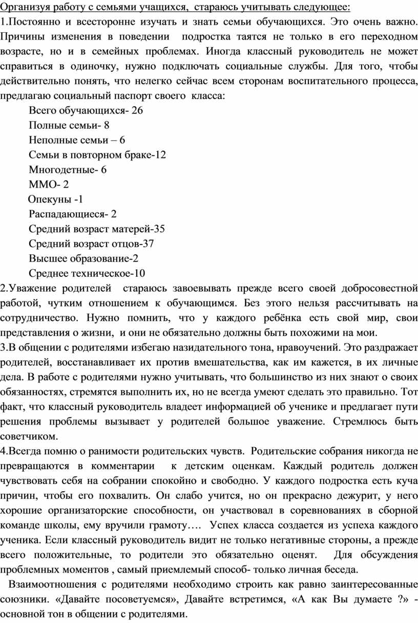 1.Постоянно и всесторонне изучать и знать семьи обучающихся. Это очень важно. Причины изменения в поведении подростка таятся не только в его переходном возрасте, но и в семейных проблемах. Иногда классный руководитель не может справиться в одиночку, нужно подключать социальные службы. Для того, чтобы действительно понять, что нелегко сейчас всем сторонам воспитательного процесса, предлагаю социальный паспорт своего класса: