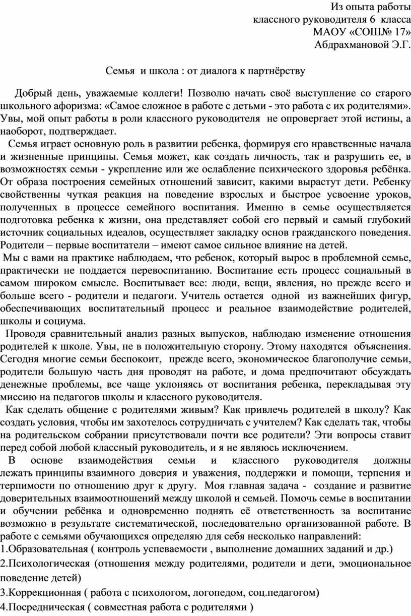 Добрый день, уважаемые коллеги! Позволю начать своё выступление со старого школьного афоризма: «Самое сложное в работе с детьми - это работа с их родителями». Увы, мой опыт работы в роли классного руководителя не опровергает этой истины, а наоборот, подтверждает.