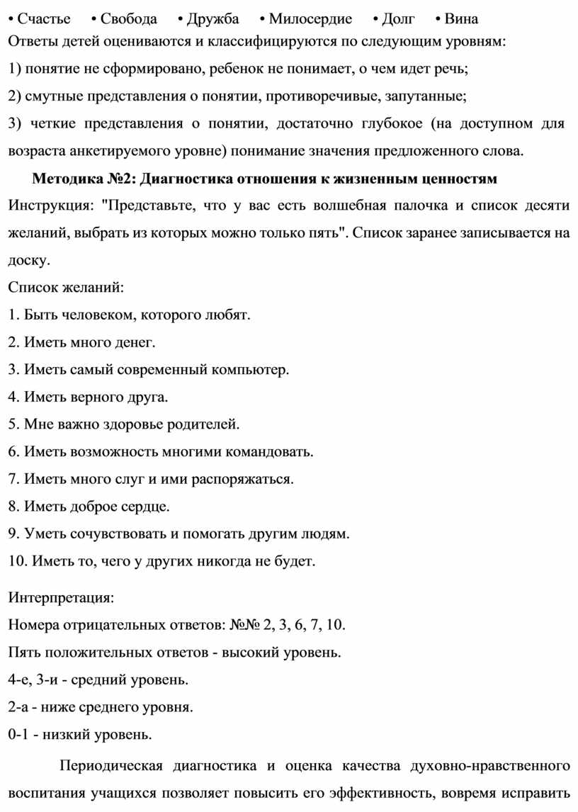 Методика №2: Диагностика отношения к жизненным ценностям