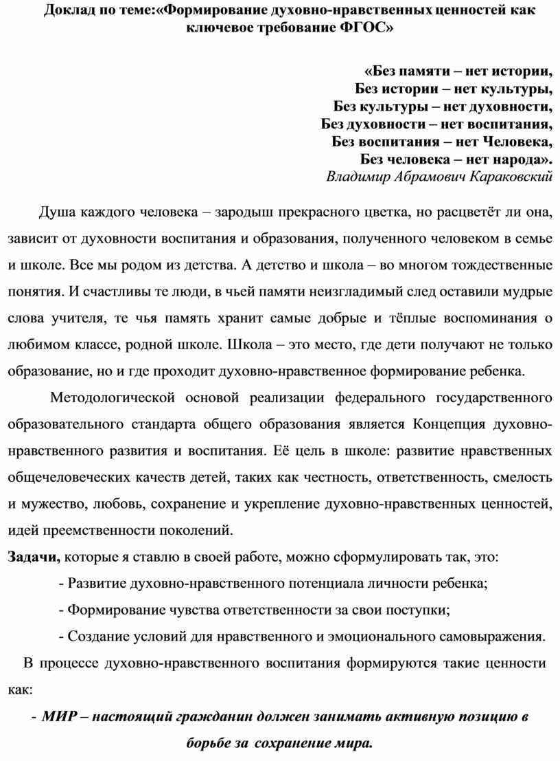 Доклад по теме:«Формирование духовно-нравственных ценностей как ключевое требование ФГОС»
