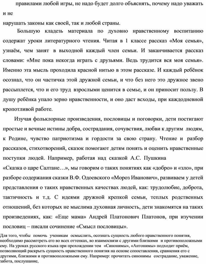 «Сказка о царе Салтане…», мы говорим о таких понятиях как «добро» и «зло», при разборе содержания сказки В.Ф. Одоевского «Мороз Иванович», развиваем у детей представления о таких нравственных качествах людей, как: трудолюбие, доброта, тактичность и т.д. С идеями дружной крепкой семьи, теплых родственных отношений, без которых не мыслима духовная личность, дети знакомятся на таких произведениях, как: «Еще мама» Андрей Платонович Платонов, при изучении пословиц – писали сочинение «Смысл пословицы».
