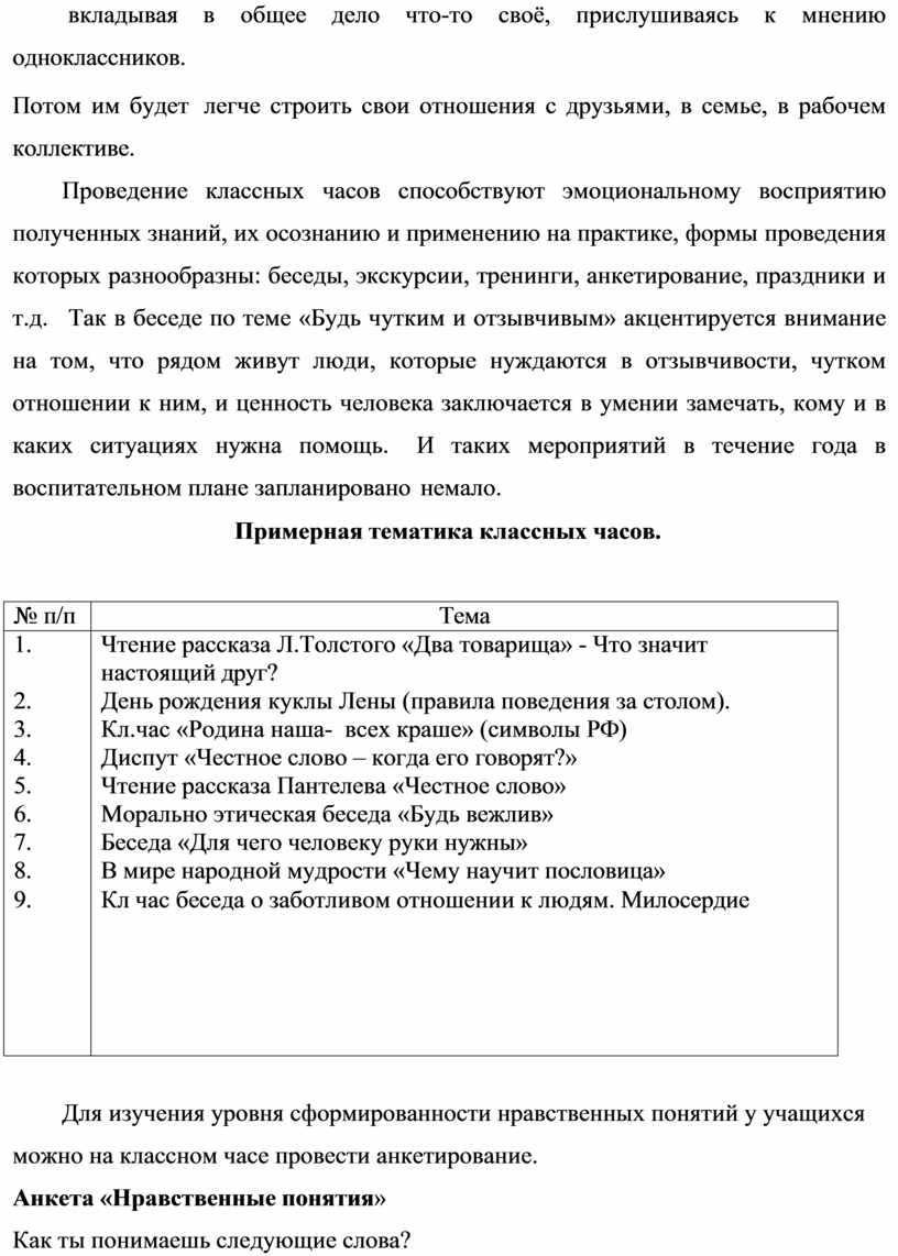 Проведение классных часов способствуют эмоциональному восприятию полученных знаний, их осознанию и применению на практике, формы проведения которых разнообразны: беседы, экскурсии, тренинги, анкетирование, праздники и т.д. Так в беседе по теме «Будь чутким и отзывчивым» акцентируется внимание на том, что рядом живут люди, которые нуждаются в отзывчивости, чутком отношении к ним, и ценность человека заключается в умении замечать, кому и в каких ситуациях нужна помощь. И таких мероприятий в течение года в воспитательном плане запланировано немало.