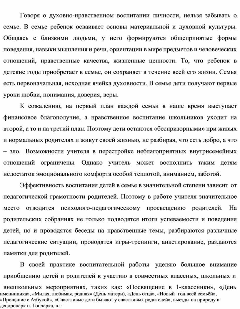 К сожалению, на первый план каждой семьи в наше время выступает финансовое благополучие, а нравственное воспитание школьников уходит на второй, а то и на третий план. Поэтому дети остаются «беспризорными» при живых и нормальных родителях и живут своей жизнью, не разбирая, что есть добро, а что – зло. Возможности учителя в перестройке неблагоприятных внутрисемейных отношений ограничены. Однако учитель может восполнить таким детям недостаток эмоционального комфорта особой теплотой, вниманием, заботой.