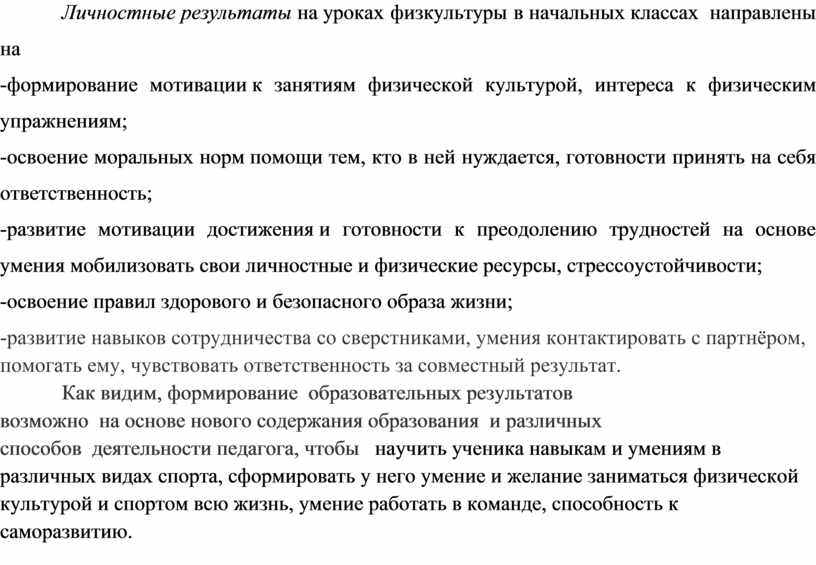 Личностные результаты на уроках физкультуры в начальных классах направлены на