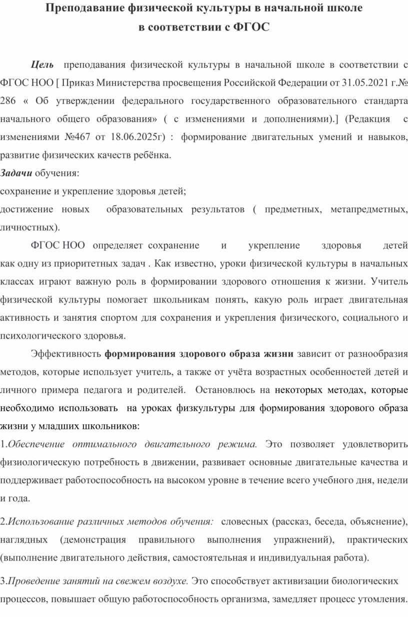 Цель преподавания физической культуры в начальной школе в соответствии с ФГОС НОО [ Приказ Министерства просвещения Российской Федерации от 31.05.2021 г.№ 286 « Об утверждении федерального государственного образовательного стандарта начального общего образования» ( с изменениями и дополнениями).] (Редакция с изменениями №467 от 18.06.2025г) : формирование двигательных умений и навыков, развитие физических качеств ребёнка.
