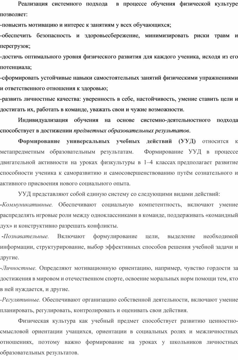 Использование системно-деятельностного подхода на уроках физической культуры в 1–4 классах способствует развитию у учащихся критического мышления, самостоятельности и активного участия в процессе обучения. Такой подход помогает формировать у школьников не только знания о физической культуре, но и важные жизненные навыки.