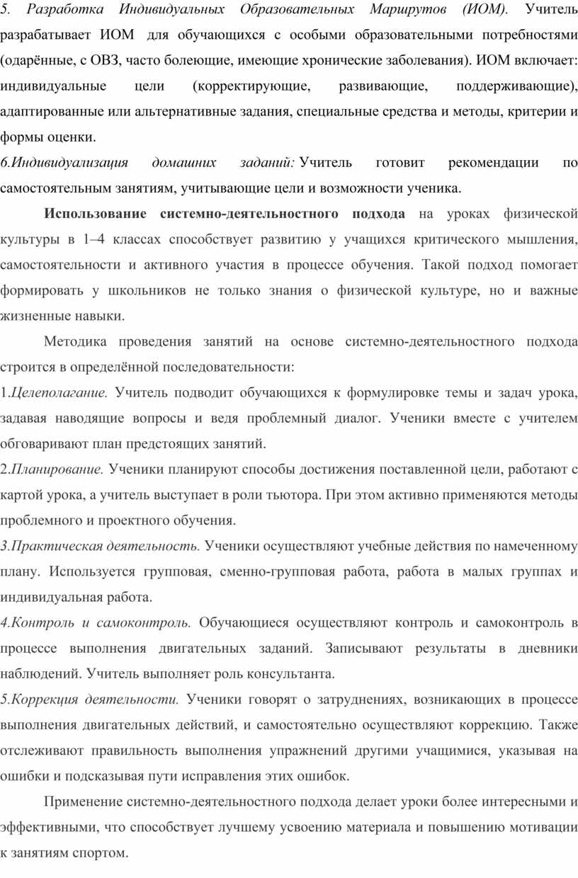 5. Разработка Индивидуальных Образовательных Маршрутов (ИОМ). Учитель разрабатывает ИОМ для обучающихся с особыми образовательными потребностями (одарённые, с ОВЗ, часто болеющие, имеющие хронические заболевания). ИОМ включает: индивидуальные цели (корректирующие, развивающие, поддерживающие), адаптированные или альтернативные задания, специальные средства и методы, критерии и формы оценки.