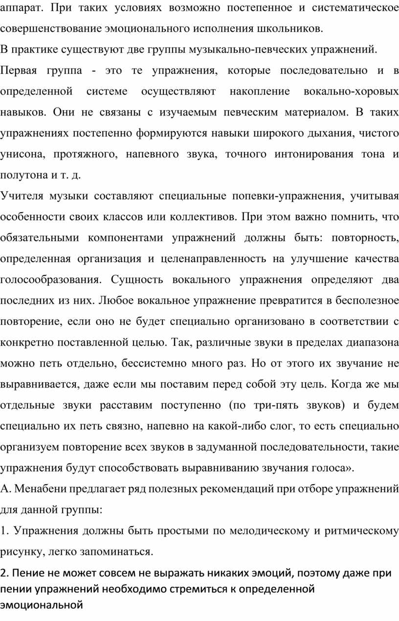 Установлено , что развитие эмоциональности и формирование вокально-хоровых навыков тесно взаимосвязаны: эмоционально окрашенное пение содействует активизации ряда вокально-формирующих процессов, влияет на певческую интонацию. Эмоциональное отношение должно проявляться на всех фазах разучивания произведения. Как показали наблюдения, эмоциональная настроенность и правильная готовность к пению - важные закономерности, характеризующие нормальное звучание детского певческого голоса. Анализ проведенных наблюдений показал, что наиболее рациональное и здоровое пение в коллективном обучении такое, при котором функционирует весь сложный нервно-двигательный голосообразующий аппарат. При таких условиях возможно постепенное и систематическое совершенствование эмоционального исполнения школьников.