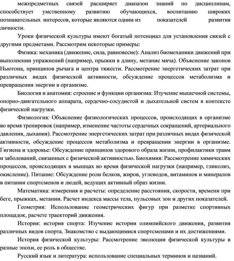 Уроки физической культуры имеют богатый потенциал для установления связей с другими предметами. Рассмотрим некоторые примеры: