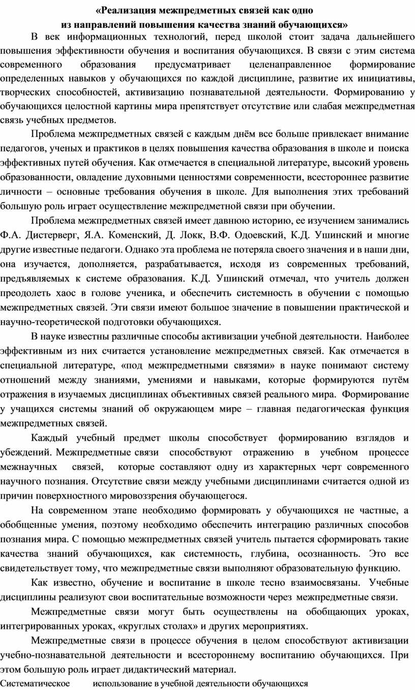 Проблема межпредметных связей имеет давнюю историю, ее изучением занимались Ф.А. Дистерверг, Я.А. Коменский, Д. Локк, В.Ф. Одоевский, К.Д. Ушинский и многие другие известные педагоги. Однако эта проблема не потеряла своего значения и в наши дни, она изучается, дополняется, разрабатывается, исходя из современных требований, предъявляемых к системе образования. К.Д. Ушинский отмечал, что учитель должен преодолеть хаос в голове ученика, и обеспечить системность в обучении с помощью межпредметных связей. Эти связи имеют большое значение в повышении практической и научно-теоретической подготовки обучающихся.