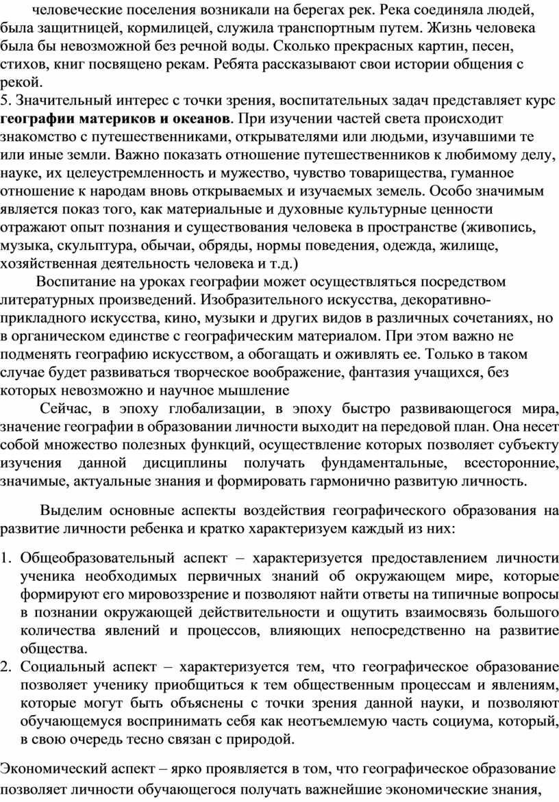 Выделим основные аспекты воздействия географического образования на развитие личности ребенка и кратко характеризуем каждый из них: