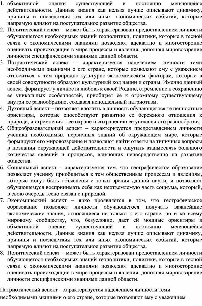 3. Экономический аспект – ярко проявляется в том, что географическое образование позволяет личности обучающегося получать важнейшие экономические знания, относящиеся не только к его стране, но и ко всему мировому сообществу, что, безусловно, дает ей мощные ориентиры в объективной оценки существующей и постоянно меняющейся действительности. Данные знания как нельзя лучше описывают динамику, причины и последствия тех или иных экономических событий, которые напрямую влияют на поступательное развитие общества.