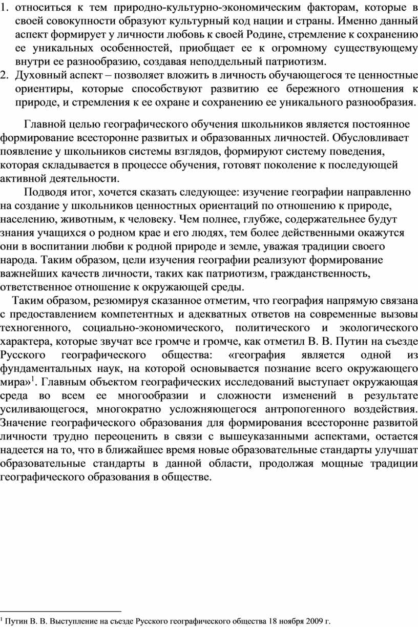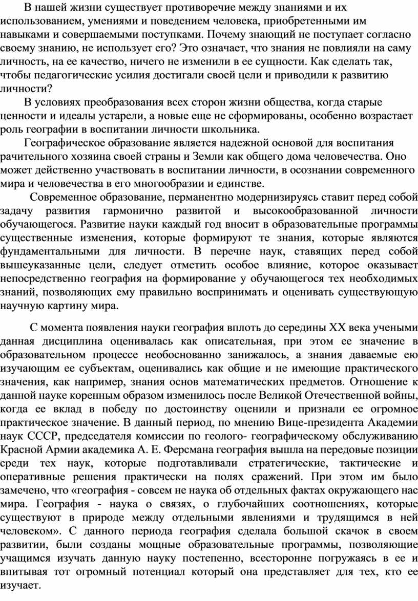 В условиях преобразования всех сторон жизни общества, когда старые ценности и идеалы устарели, а новые еще не сформированы, особенно возрастает роль географии в воспитании личности школьника.
