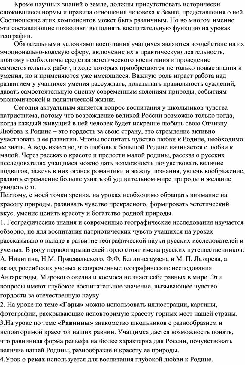 Кроме научных знаний о земле, должны присутствовать исторически сложившиеся нормы и правила отношения человека к Земле, представления о ней. Соотношение этих компонентов может быть различным. Но во многом именно эти составляющие позволяют выполнять воспитательную функцию на уроках географии.