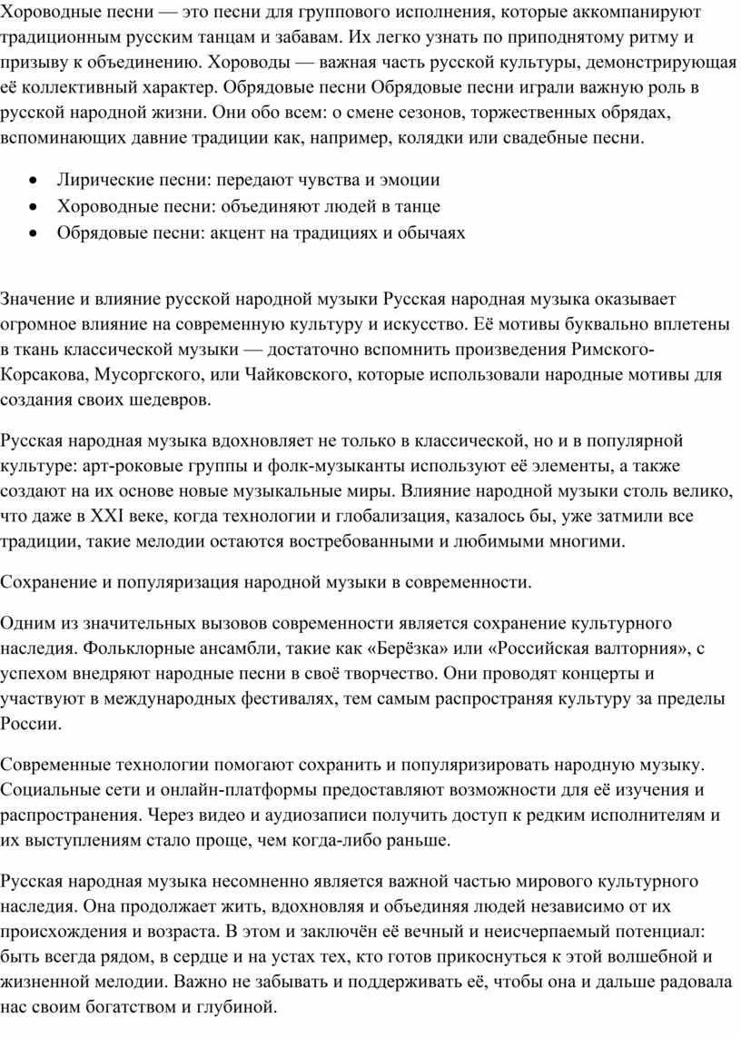Русская народная музыка несомненно является важной частью мирового культурного наследия. Она продолжает жить, вдохновляя и объединяя людей независимо от их происхождения и возраста. В этом и заключён её вечный и неисчерпаемый потенциал: быть всегда рядом, в сердце и на устах тех, кто готов прикоснуться к этой волшебной и жизненной мелодии. Важно не забывать и поддерживать её, чтобы она и дальше радовала нас своим богатством и глубиной.