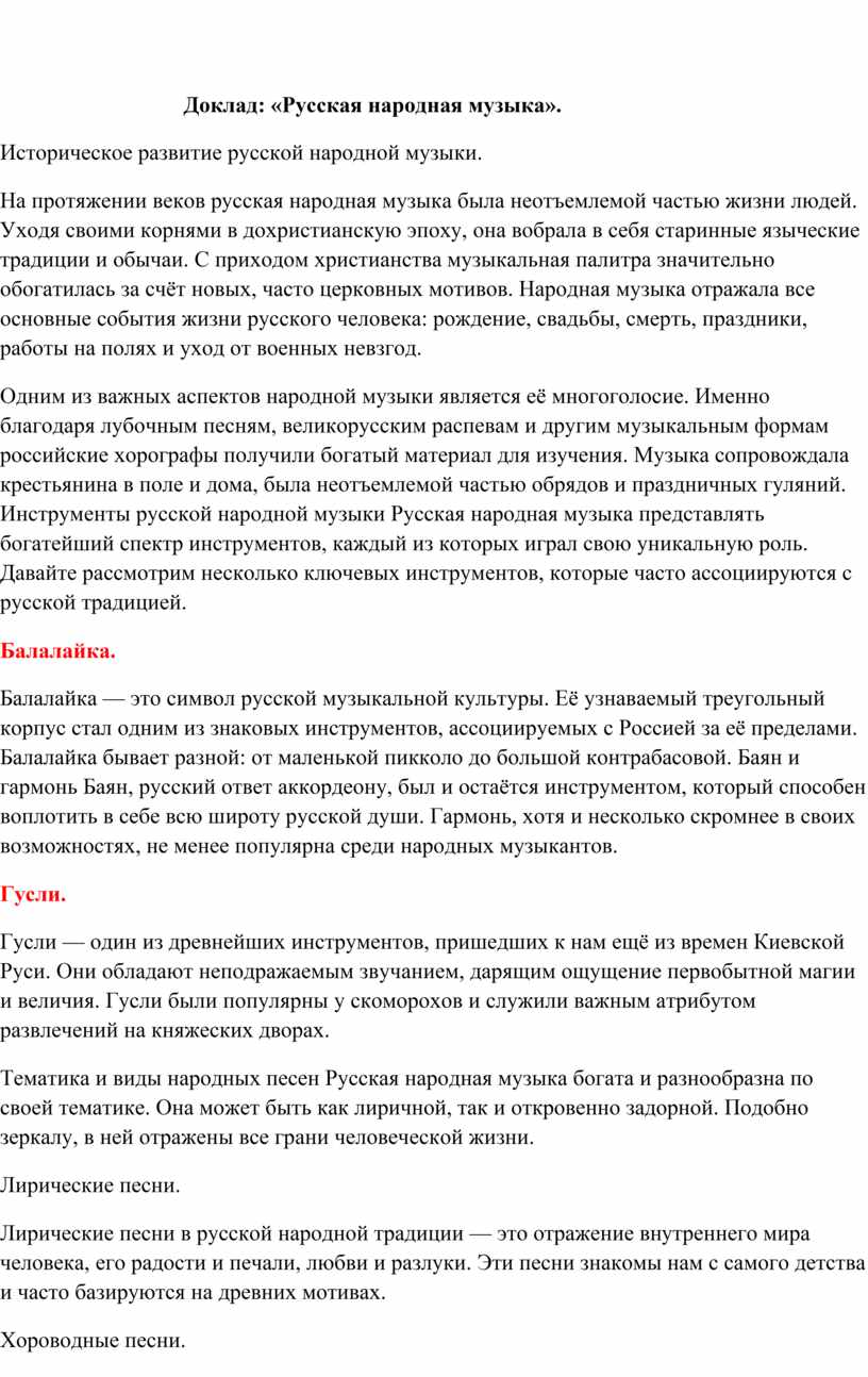 Одним из важных аспектов народной музыки является её многоголосие. Именно благодаря лубочным песням, великорусским распевам и другим музыкальным формам российские хорографы получили богатый материал для изучения. Музыка сопровождала крестьянина в поле и дома, была неотъемлемой частью обрядов и праздничных гуляний. Инструменты русской народной музыки Русская народная музыка представлять богатейший спектр инструментов, каждый из которых играл свою уникальную роль. Давайте рассмотрим несколько ключевых инструментов, которые часто ассоциируются с русской традицией.