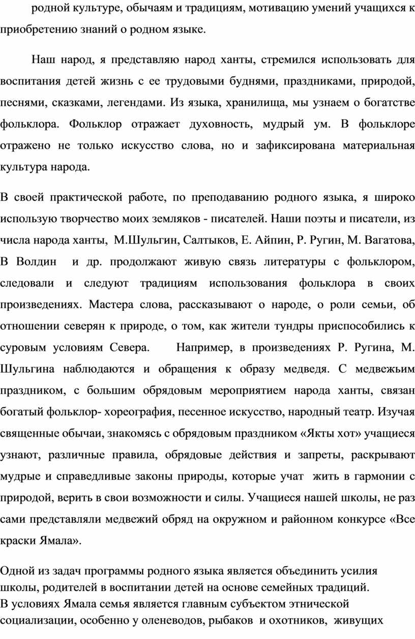 Одной из задач программы родного языка является объединить усилия школы, родителей в воспитании детей на основе семейных традиций. В условиях Ямала семья является главным субъектом этнической социализации, особенно у оленеводов, рыбаков и охотников, живущих вдали от городов и больших населенных пунктов. Для социализации в семье хантыйского ребенка были характерны: раннее включение в жизнедеятельность семьи, не только участие в посильном труде, но и в решении разнообразных жизненных задач, самостоятельность, активность, быстрое усвоение социальных норм и правил, и выстраивание своего поведения в соответствии с ними. Родители видели в ребенке надежного помощника, опору в старости. И для многих поколений народа ханты такие факторы как воспитание в детстве в маленьких сельских местностях, в стойбищах не становились помехой в успешной социализации ребенка в иной социальной среде. Любовь родителей, их высокая требовательность и вера в силы ребенка, уважение к ним являлись источником достижений успехов человека.