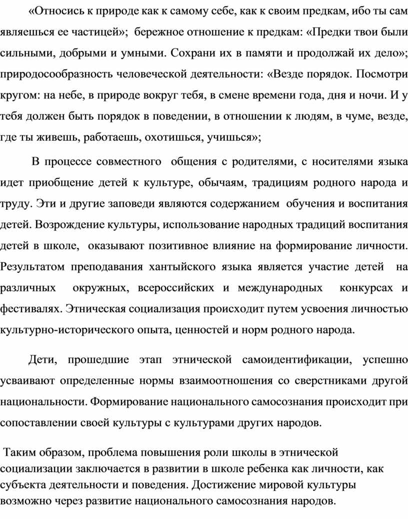 В процессе совместного общения с родителями, с носителями языка идет приобщение детей к культуре, обычаям, традициям родного народа и труду. Эти и другие заповеди являются содержанием обучения и воспитания детей. Возрождение культуры, использование народных традиций воспитания детей в школе, оказывают позитивное влияние на формирование личности. Результатом преподавания хантыйского языка является участие детей на различных окружных, всероссийских и международных конкурсах и фестивалях. Этническая социализация происходит путем усвоения личностью культурно-исторического опыта, ценностей и норм родного народа.
