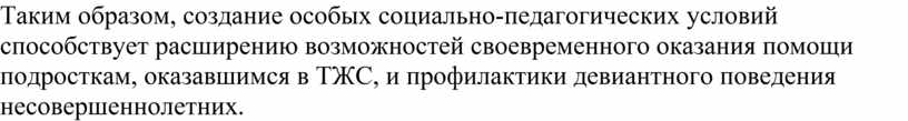 Таким образом, создание особых социально-педагогических условий способствует расширению возможностей своевременного оказания помощи подросткам, оказавшимся в ТЖС, и профилактики девиантного поведения несовершеннолетних.