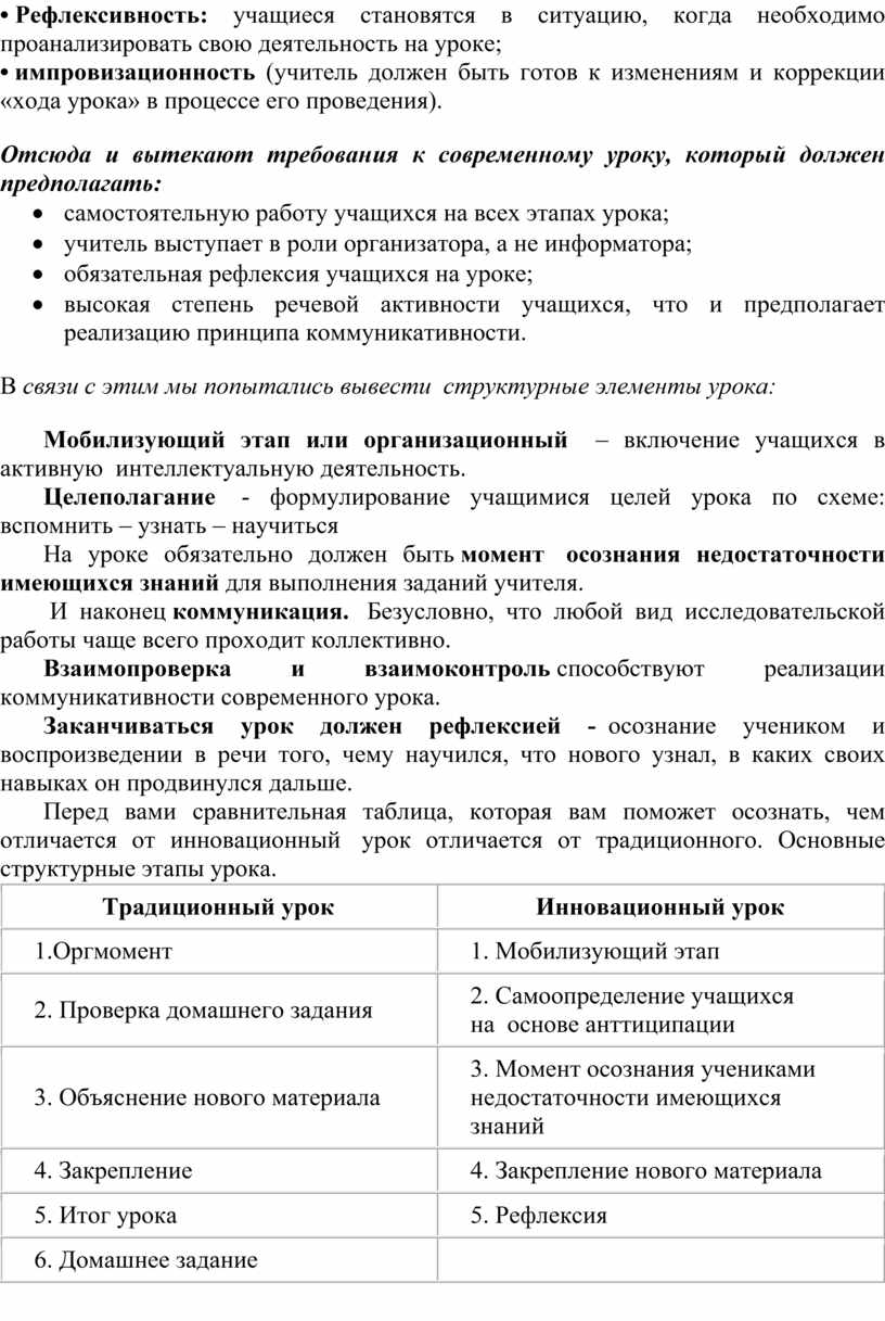 Перед вами сравнительная таблица, которая вам поможет осознать, чем отличается от инновационный урок отличается от традиционного. Основные структурные этапы урока.