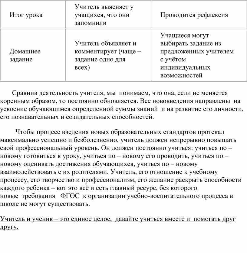 Сравнив деятельность учителя, мы понимаем, что она, если не меняется коренным образом, то постоянно обновляется. Все нововведения направлены на усвоение обучающимся определенной суммы знаний и на развитие его личности, его познавательных и созидательных способностей.