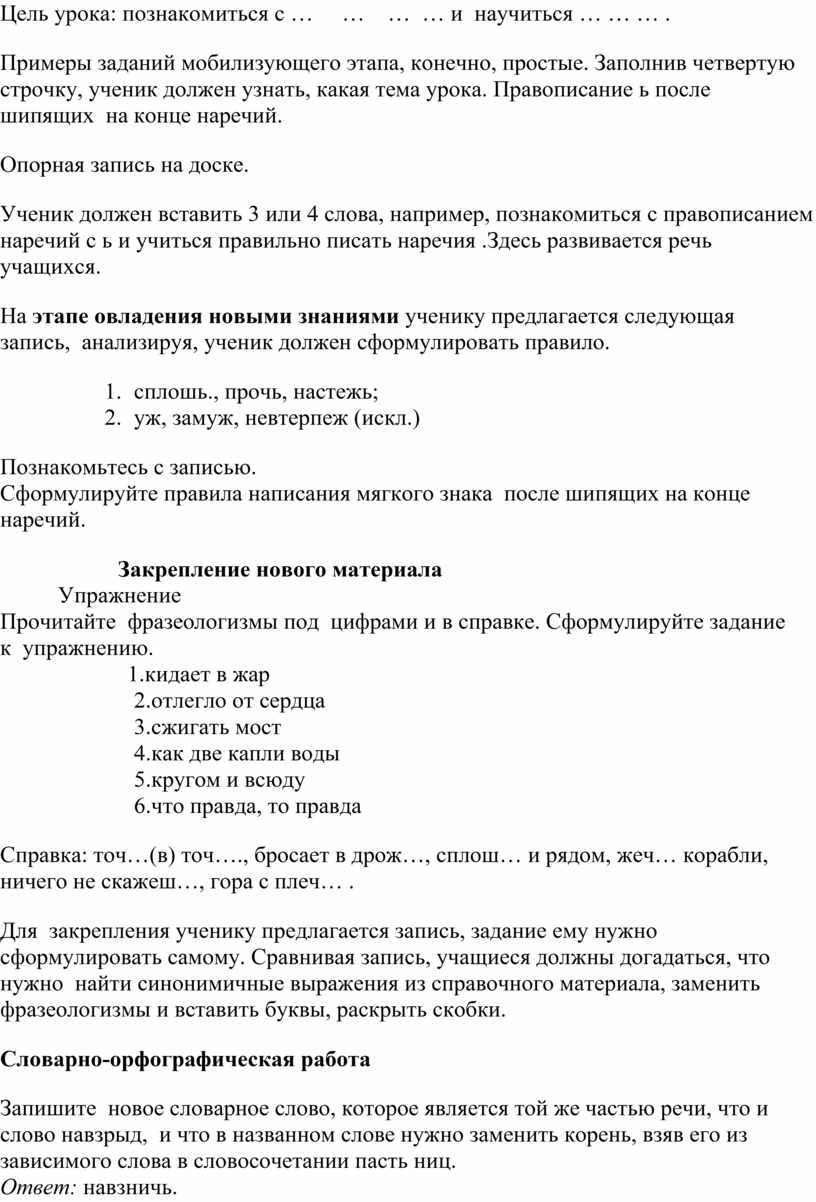 Ученик должен вставить 3 или 4 слова, например, познакомиться с правописанием наречий с ь и учиться правильно писать наречия .Здесь развивается речь учащихся.