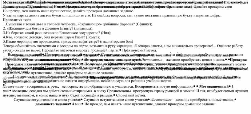 Но прежде, чем начать наше путешествие, давайте проверим домашнее задание. У вас на партах лежит листок бумаги, подпишите его. На слайдах вопросы, вам нужно поставить правильную букву напротив цифры. Проводится тест: 1.Существо с телом льва и головой человека, «охраняющее» гробницы фараона? (Сфинкс); 2. «Жилище» для богов в Древнем Египте? (пирамида); 3.На берегах какой реки возникло Египетское государство? (Нил); 4.Кто, согласно легенде, был первым царем Рима? (Ромул); 5.Какие мероприятия проводились в римском амфитеатре? (гладиаторские бои) Теперь обменяйтесь листочками с соседом по парте, возьмите в руку карандаш. Я говорю ответы, а вы внимательно проверяйте!... Оцените работу своего соседа по парте. Передайте листочки вперед с последней парты. |