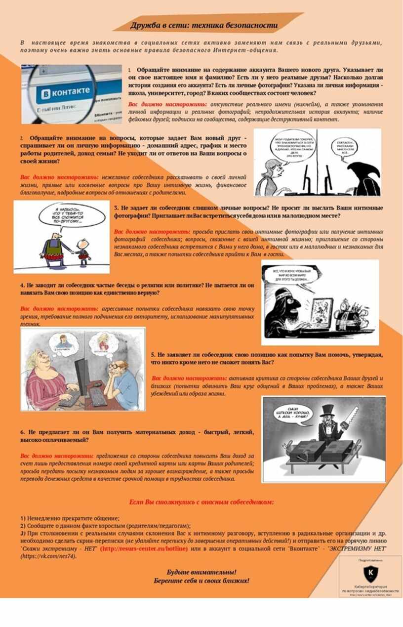 Информационную безопасность невозможно обеспечить одними только фильтрами и запретами, необходима планомерная работа с детьми и родителями по воспитанию информационной культуры. Информационная культура подразумевает не только владение навыками получения необходимой информации с помощью ИКТ, но и выработку навыков общения в сети, построенных на вежливом и доброжелательном отношении к виртуальным собеседникам. Учащимся необходимо объяснять, что их поведение в сети – манера общения в пабликах, размещаемые посты, фотографии формируют их «цифровой портрет», по которому о них могут судить не только случайные знакомые в сети, но и те, с кем им придется общаться в реальности, например, будущие однокурсники. Еще один навык, необходимый для безопасного существования в сети - критический подход к информации, в ней размещенной. Дети должны четко представлять, что далеко не все в Интернете нужно принимать за чистую монету, это касается, как контента, так и личностей, с которыми они могут столкнуться на просторах Интернета.