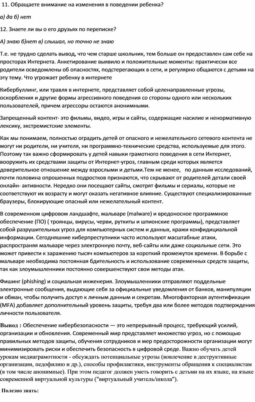 Вывод : Обеспечение кибербезопасности — это непрерывный процесс, требующий усилий, организации и обновления. Современный мир представляет множество угроз, но с помощью правильных методов защиты, обучения сотрудников и мер предосторожности организации могут минимизировать риски и обеспечить безопасность в цифровой среде. Важно обучать детей урокам медиаграмотности - обсуждать потенциальные угрозы (вовлечение в деструктивные организации, педофилию и др.), способы профилактики, инструменты обращения к специалистам (в том числе анонимные). При этом педагог должен уметь говорить с детьми на их языке, на языке современной виртуальной культуры ("виртуальный учитель/школа").