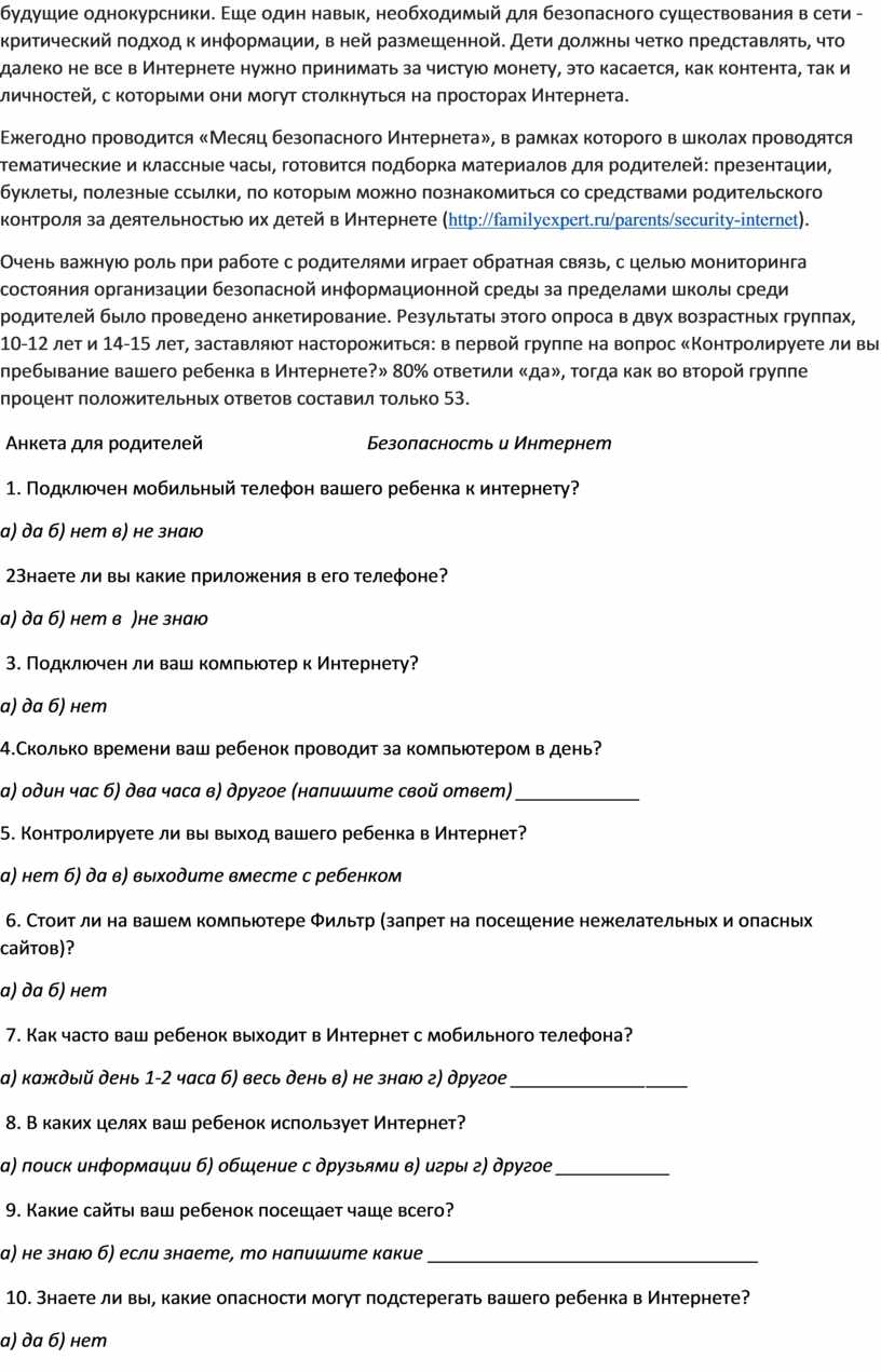 Анкета для родителей Безопасность и Интернет