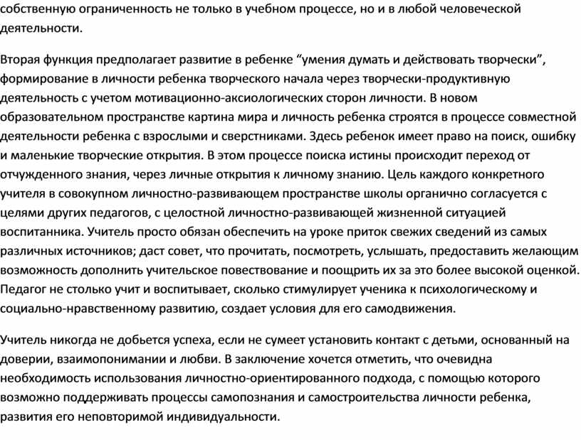 Вторая функция предполагает развитие в ребенке “умения думать и действовать творчески”, формирование в личности ребенка творческого начала через творчески-продуктивную деятельность с учетом мотивационно-аксиологических сторон личности. В новом образовательном пространстве картина мира и личность ребенка строятся в процессе совместной деятельности ребенка с взрослыми и сверстниками. Здесь ребенок имеет право на поиск, ошибку и маленькие творческие открытия. В этом процессе поиска истины происходит переход от отчужденного знания, через личные открытия к личному знанию. Цель каждого конкретного учителя в совокупном личностно-развивающем пространстве школы органично согласуется с целями других педагогов, с целостной личностно-развивающей жизненной ситуацией воспитанника. Учитель просто обязан обеспечить на уроке приток свежих сведений из самых различных источников; даст совет, что прочитать, посмотреть, услышать, предоставить желающим возможность дополнить учительское повествование и поощрить их за это более высокой оценкой. Педагог не столько учит и воспитывает, сколько стимулирует ученика к психологическому и социально-нравственному развитию, создает условия для его самодвижения.