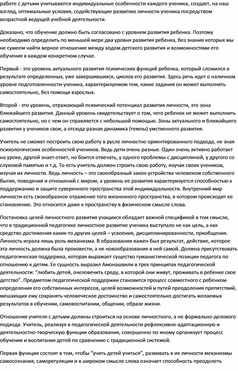 Личностно-ориентированная система, опираясь на то, что личность-это единство психических свойств, составляющих её индивидуальность, реализуя своей технологией важный психолого-педагогический принцип индивидуального подхода, согласно которому в учебно-воспитательной работе с детьми учитываются индивидуальные особенности каждого ученика, создает, на наш взгляд, оптимальные условия, содействующие развитию личности ученика посредством возрастной ведущей учебной деятельности.