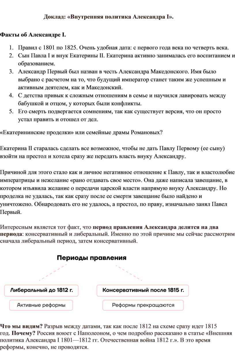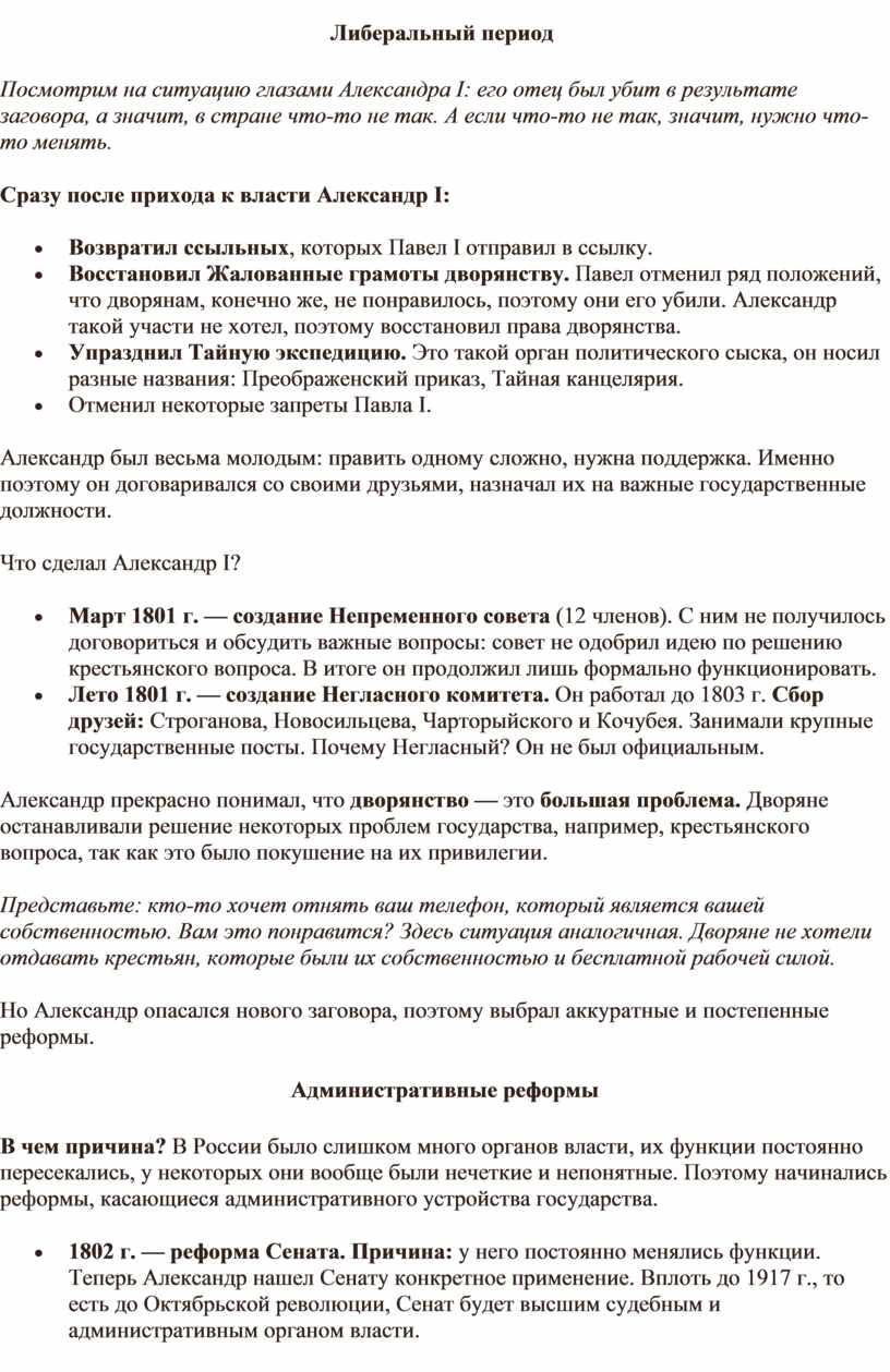 Интересным является тот факт, что период правления Александра делится на два периода: консервативный и либеральный. Именно по этой причине мы сейчас рассмотрим сначала либеральный период, затем консервативный.