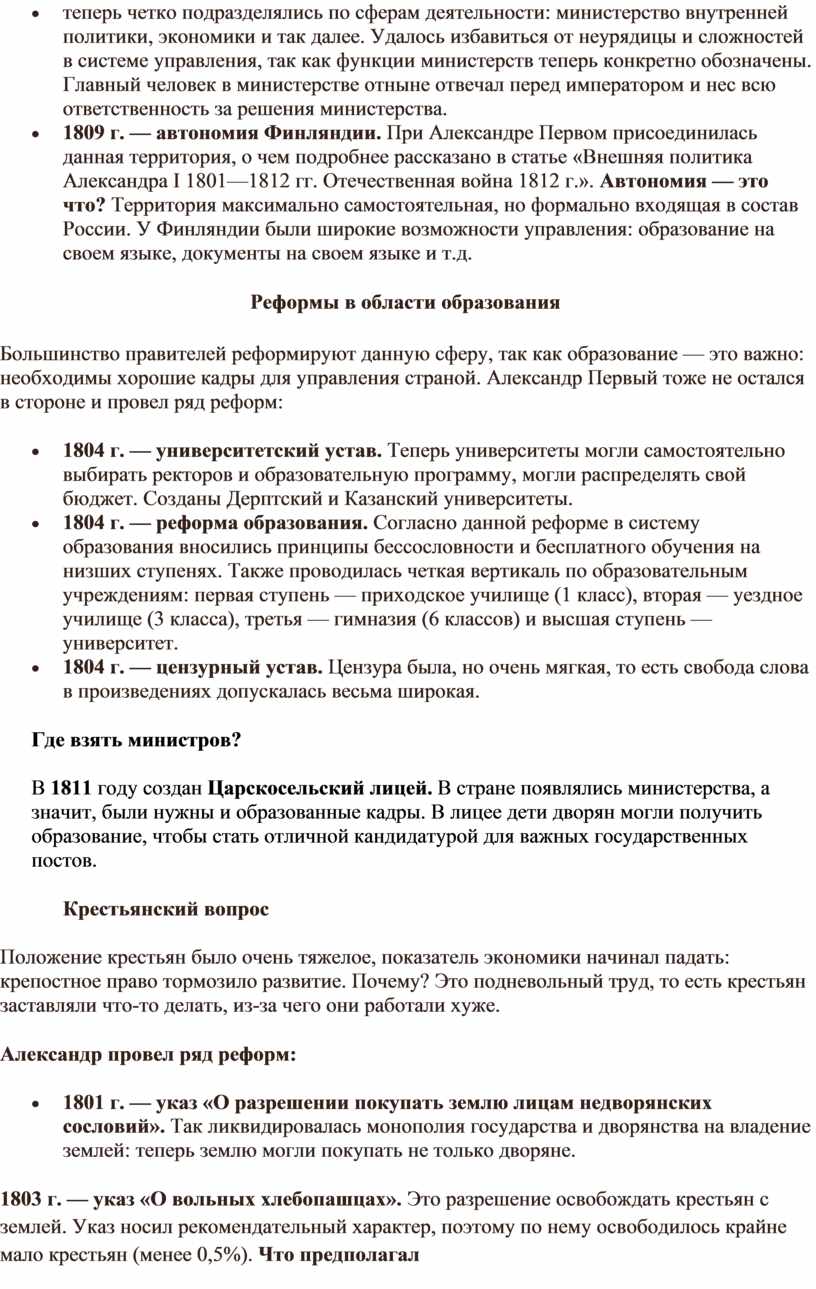 Большинство правителей реформируют данную сферу, так как образование — это важно: необходимы хорошие кадры для управления страной. Александр Первый тоже не остался в стороне и провел ряд реформ: