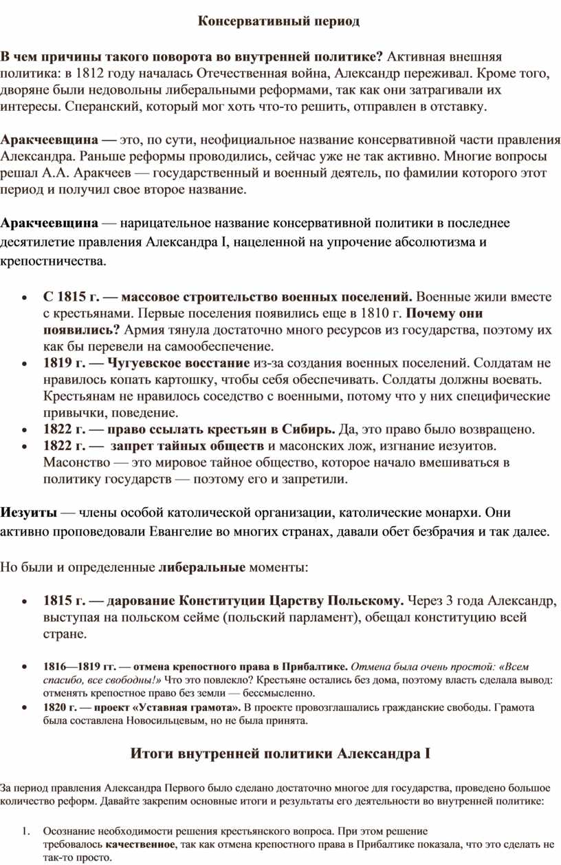 В чем причины такого поворота во внутренней политике? Активная внешняя политика: в 1812 году началась Отечественная война, Александр переживал. Кроме того, дворяне были недовольны либеральными реформами, так как они затрагивали их интересы. Сперанский, который мог хоть что-то решить, отправлен в отставку.