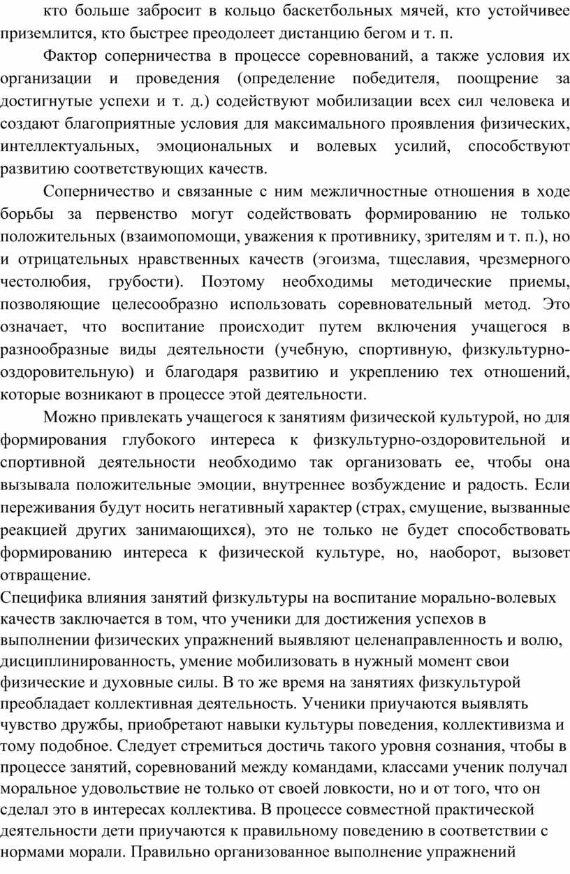 Специфика влияния занятий физкультуры на воспитание морально-волевых качеств заключается в том, что ученики для достижения успехов в выполнении физических упражнений выявляют целенаправленность и волю, дисциплинированность, умение мобилизовать в нужный момент свои физические и духовные силы. В то же время на занятиях физкультурой преобладает коллективная деятельность. Ученики приучаются выявлять чувство дружбы, приобретают навыки культуры поведения, коллективизма и тому подобное. Следует стремиться достичь такого уровня сознания, чтобы в процессе занятий, соревнований между командами, классами ученик получал моральное удовольствие не только от своей ловкости, но и от того, что он сделал это в интересах коллектива. В процессе совместной практической деятельности дети приучаются к правильному поведению в соответствии с нормами морали. Правильно организованное выполнение упражнений группами, командные игры, участие в соревнованиях способствуют входу ребенка в коллектив и воспитанию у него привычки жить интересами коллектива.