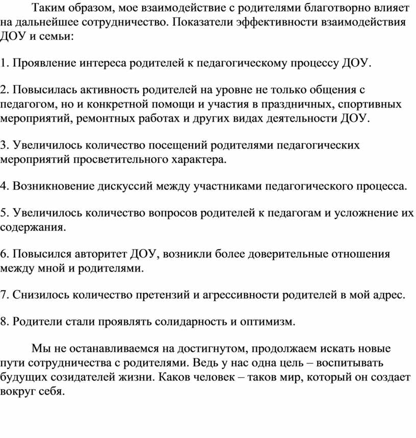 Таким образом, мое взаимодействие с родителями благотворно влияет на дальнейшее сотрудничество. Показатели эффективности взаимодействия ДОУ и семьи: