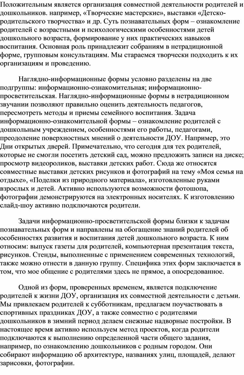 Нетрадиционные формы. К ним относятся: информационно-аналитические; досуговые; познавательные; наглядно-информационные формы.