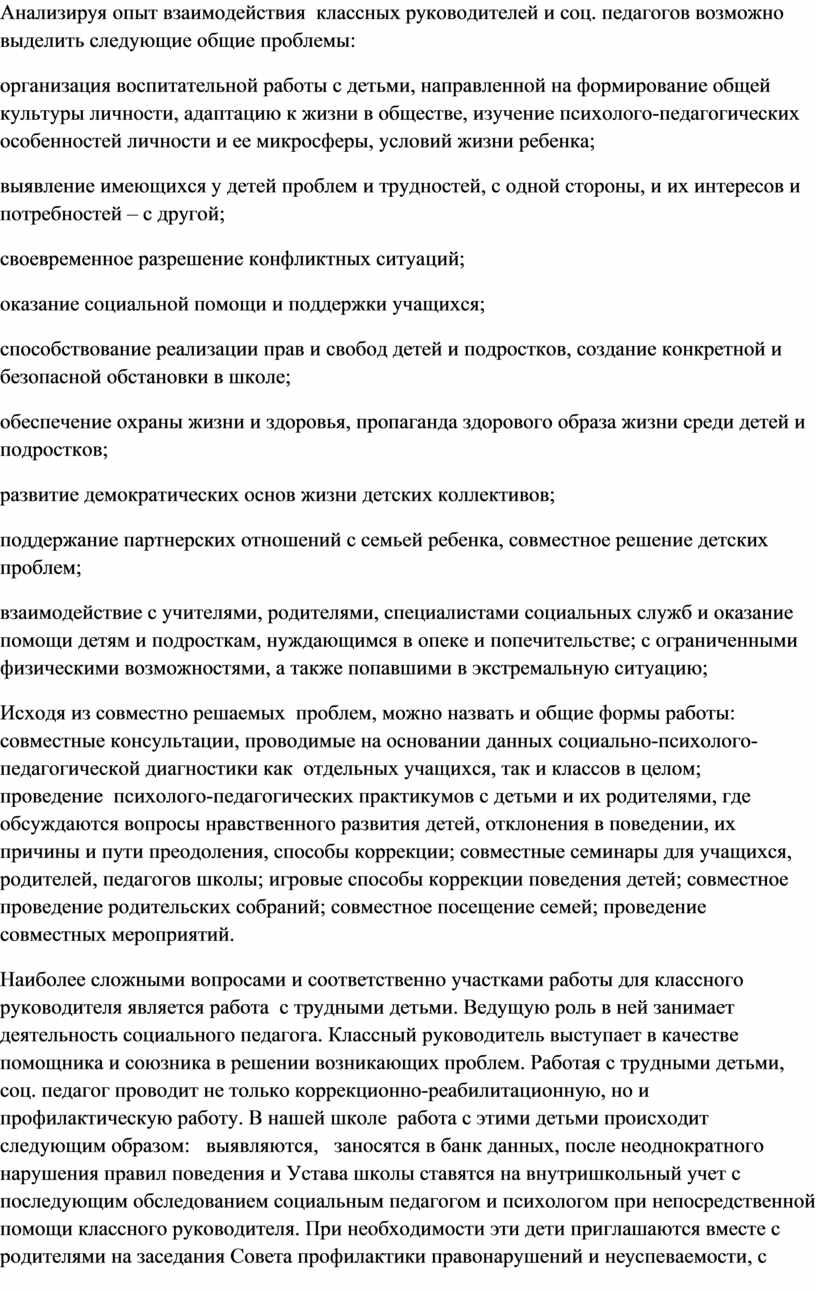 Анализируя опыт взаимодействия классных руководителей и соц. педагогов возможно выделить следующие общие проблемы: